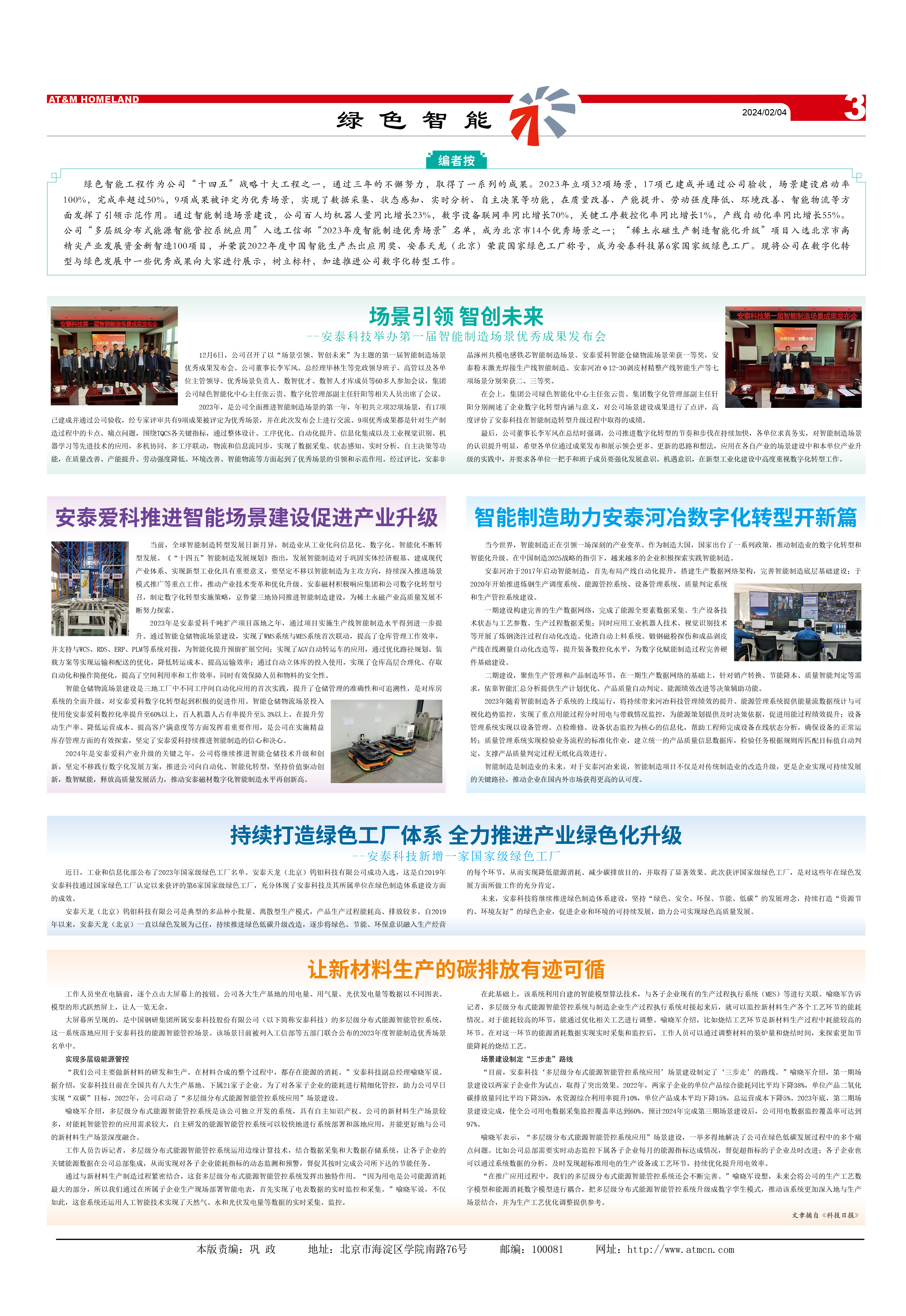綠色智能工程作為公司“十四五”戰(zhàn)略十大工程之一,通過三年的不懈努力,取得了一系列的成果。2023年立項(xiàng)32項(xiàng)場景,17項(xiàng)已建成并通過公司驗(yàn)收,場景建設(shè)啟動率100%,完成率超過50%,9項(xiàng)成果被評定為優(yōu)秀場景,實(shí)現(xiàn)了數(shù)據(jù)采集、狀態(tài)感知、實(shí)時(shí)分析、自主決策等功能,在質(zhì)量改善、產(chǎn)能提升、勞動強(qiáng)度降低、環(huán)境改善、智能物流等方面發(fā)揮了引領(lǐng)示范作用。通過智能制造場景建設(shè),公司百人均機(jī)器人量同比增長23%,數(shù)字設(shè)備聯(lián)網(wǎng)率同比增長70%,關(guān)鍵工序數(shù)控化率同比增長1%,產(chǎn)線自動化率同比增長55%。公司“多層級分布式能源智能管控系統(tǒng)應(yīng)用”入選工信部“2023年度智能制造優(yōu)秀場景”名單,成為北京市14個(gè)優(yōu)秀場景之一;“稀土永磁生產(chǎn)制造智能化升級”項(xiàng)目入選北京市高精尖產(chǎn)業(yè)發(fā)展資金新智造100項(xiàng)目,并榮獲2022年度中國智能生產(chǎn)杰出應(yīng)用獎(jiǎng)、安泰天龍(北京)榮獲國家綠色工廠稱號,成為安泰科技第6家國家級綠色工廠。現(xiàn)將公司在數(shù)字化轉(zhuǎn)型與綠色發(fā)展中一些優(yōu)秀成果向大家進(jìn)行展示,樹立標(biāo)桿,加速推進(jìn)公司數(shù)字化轉(zhuǎn)型工作。